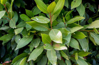 A la part exterior trobem algun roure i alzines però el que més ens crida l'atenció és un arbret, probablement plantat en algun moment: el llorer.(foto 1)