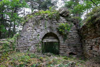 Poc després el camí entra en un bosc densament poblat de roures, alzines, castanyers, pins roigs i pinastres. El corriol de pujada desemboca en una pista ampla i assolellada i arribareu a dalt del cingle. A prop, a mà dreta hi trobareu la bassa de Sabaters. Seguiu la pista a la dreta i entrareu en un bosc dens d’alzines, roures i pi roigs, que guarda les restes de l’ermita romànica de Santa Margarida d’Ardola. El darrer tram de pujada recorre un sender entre grans blocs de gres i balmes que serien bon refugi pels antics bandolers de Vilanova de Sau.
