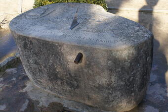Just al centre hi veureu una gran pedra de granit, col·locada expressament aquí l’any 1982. Sobre aquesta pedra, en Jaume Salichs, amb la col·laboració d’altres industrials del poble, va dissenyar i construir una font amb un rellotge de sol horitzontal molt singular. Les hores i el gnòmon —és a dir, la peça que projecta l’ombra— estan fets d’acer.