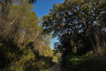 Només començar el camí s’endinsa en un bosc on la presencia del pi blanc es fa més que evident. Esquitxat de roures a les raconades més frescals, també deixa lloc a altres formacions vegetals com les garrigues i les brolles de romaní amb llentiscle i càrritx. De tant en tant, anirem trobant la palmera autòctona del Mediterrani i gairebé més representativa del Parc del Garraf: el margalló, que al finals de setembre llueix els seus cridaners fruits de color taronja. El paisatge forestal, s’alterna amb camps d’oliveres i vinyes .