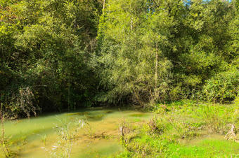 Entrarem a la llera de la riera, la humitat ambiental permet una vegetació selvàtica on destaquen grans avellaners coberts per lianes. A tocar del curs de l'aigua, salzes i sargues ocupen els espais on els altres arbres no poden créixer. Entre les seves arrels i sota les pedres, s'amaga una diversitat de fauna aquàtica força ben conservada.
