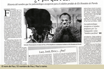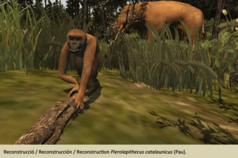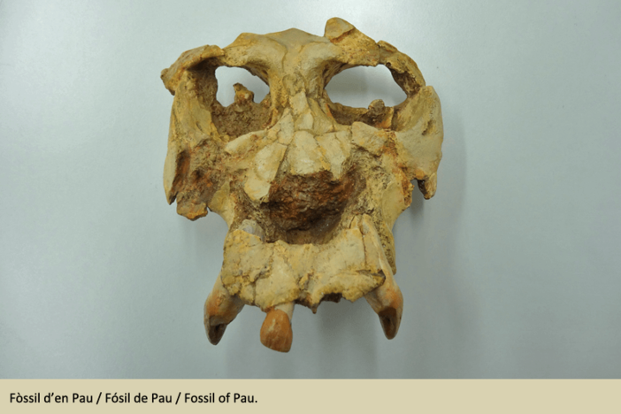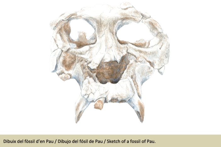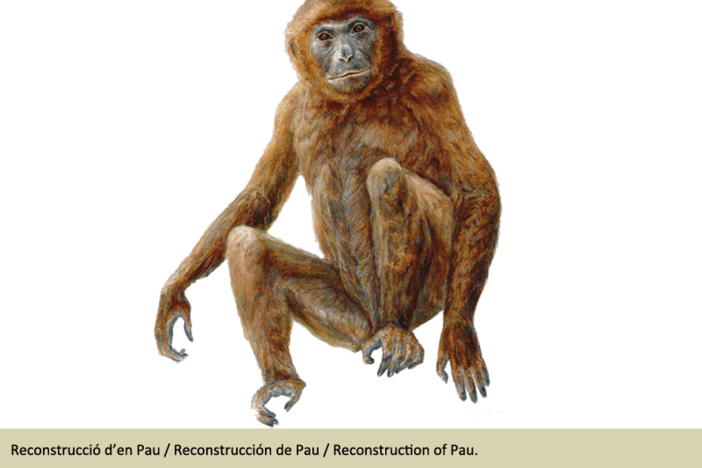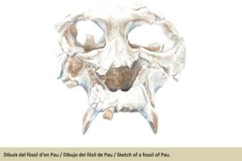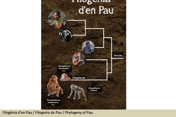 ¡Ahora que estamos aquí, fijaos en Pau! Pau es el fósil de un homínido de hace 12 millones de años. Su nombre científico es Pierolapithecus catalaunicus, es decir, “simio catalán de Pierola”. Sus restos han servido a la ciencia para describir un nuevo género y una nueva especie. Se trata, por tanto, de un holotipo.