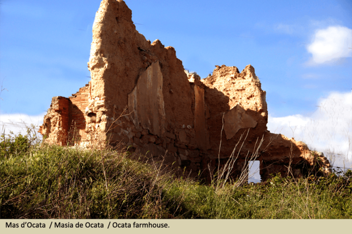 ¿Qué construcción es esta que tenemos delante? Es la Masía de Ocata. De la antigua masía solo se conserva un arco diafragma y un horno de ladrillo. Este lugar fue prospectado en los años 1940 y 50 por Crusafont y Villalta, quienes encontraron una gran cantidad de fósiles de animales del Vallesiense.