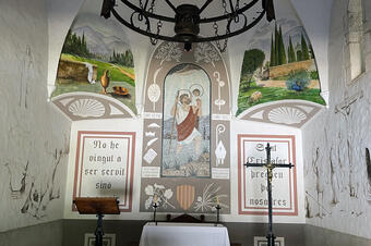 L’interior només s’obre en dates especials, com l’aplec de Sant Cristòfol, però es pot espiar per la porta i veure-hi l’altar, el mosaic del sant i les pintures murals.