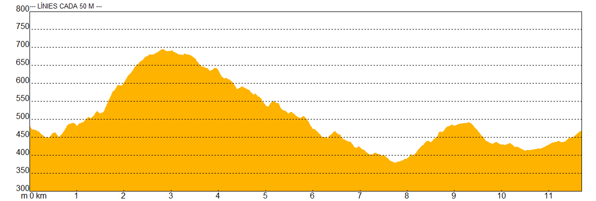 Seguirem aquest camí ben marcat per un bosc de pi pinastre amb algunes clapes d’auró blanc a dins del barranc.